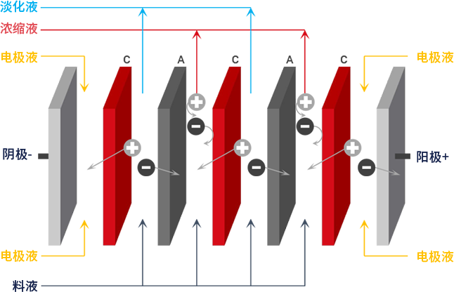 恒流電離子系統(tǒng)是電化學(xué)過程和滲析擴(kuò)散過程的結(jié)合,在外加直流電場(chǎng)的驅(qū)動(dòng)下,利用離子交換膜的選擇透過性(即陽離子可以透過陽離子交換膜,陰離子可以透過陰離子交換膜),陰、陽離子分別向陽極和陰極移動(dòng)。